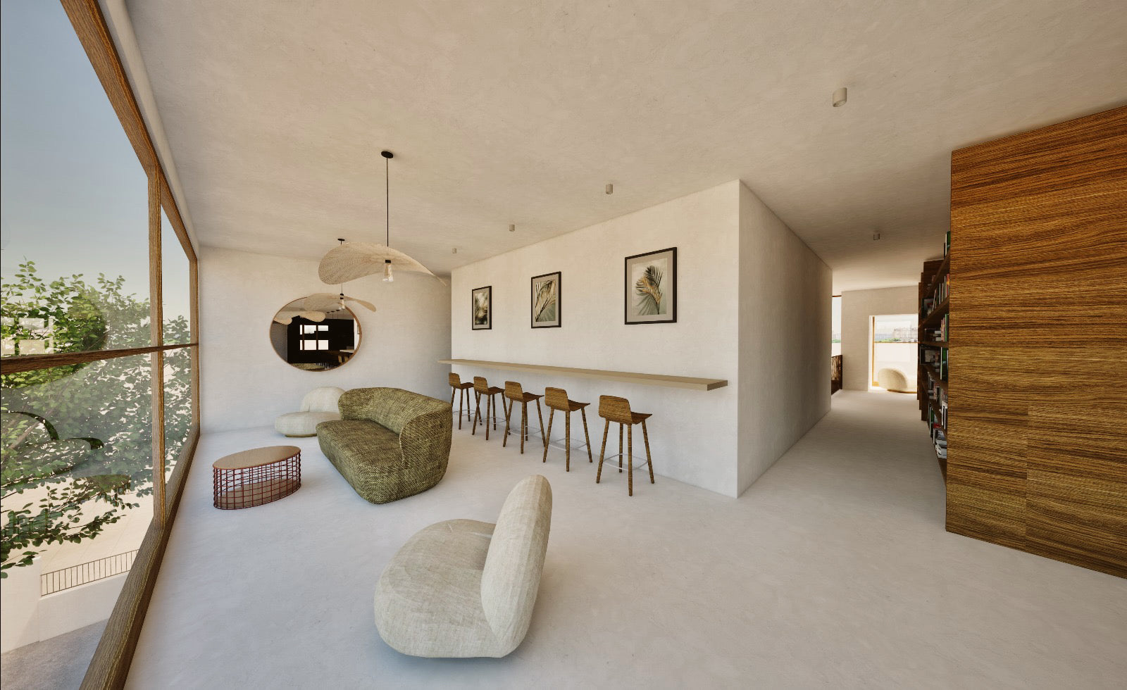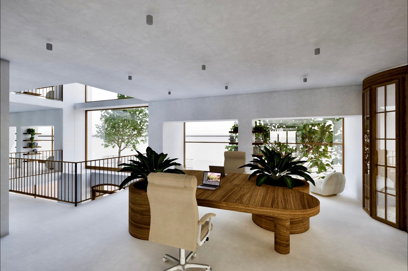 La palette de matériaux, mêlant bois naturel, tons clairs, touches végétales et éléments métalliques, contribue à créer une atmosphère à la fois professionnelle, chaleureuse et maîtrisée.