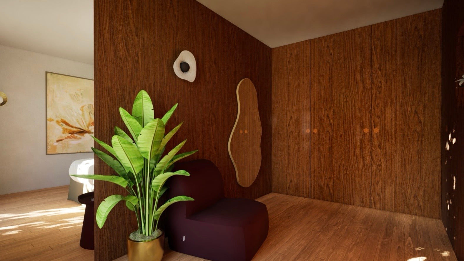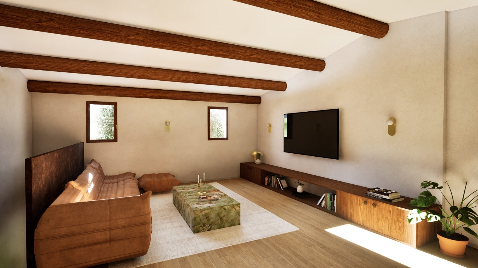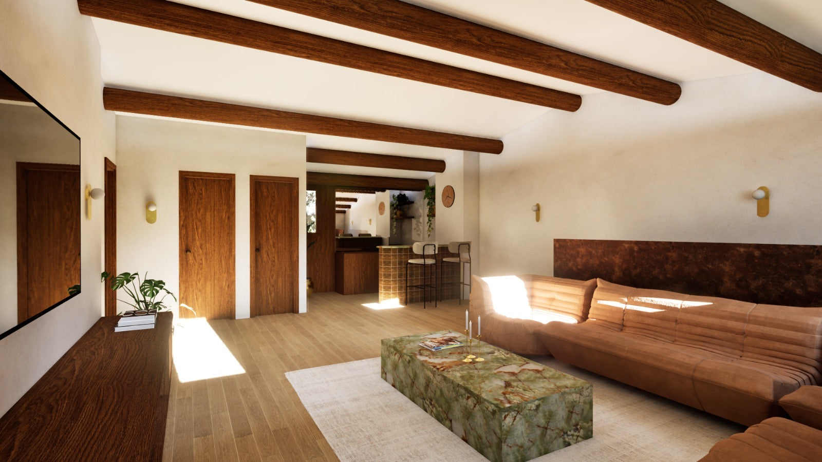L’étage se vit comme un espace à part, plus intime. Un lieu dédié à la détente et à la réception, articulé autour d’un espace télévision et d’un bar. Une chambre avec dressing, une salle d’eau et des toilettes complètent ce niveau.